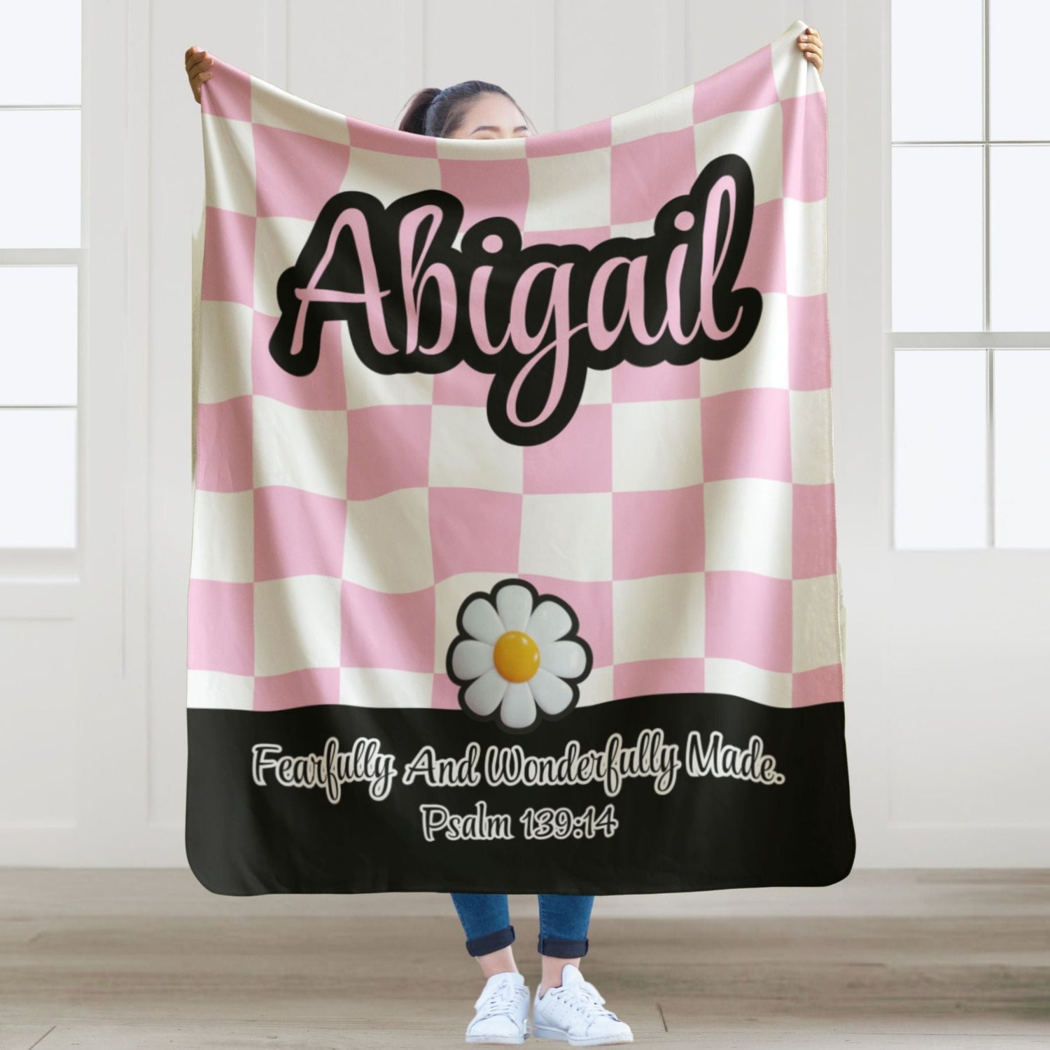 Our personalized Fearfully and Wonderfully Made Sherpa Fleece Throw Blanket features a checkered white and pink pattern background, an image of a flower, and the words "Fearfully And Wonderfully Made. Psalm 139:14." The design is printed on the front of the lightweight throw blanket.