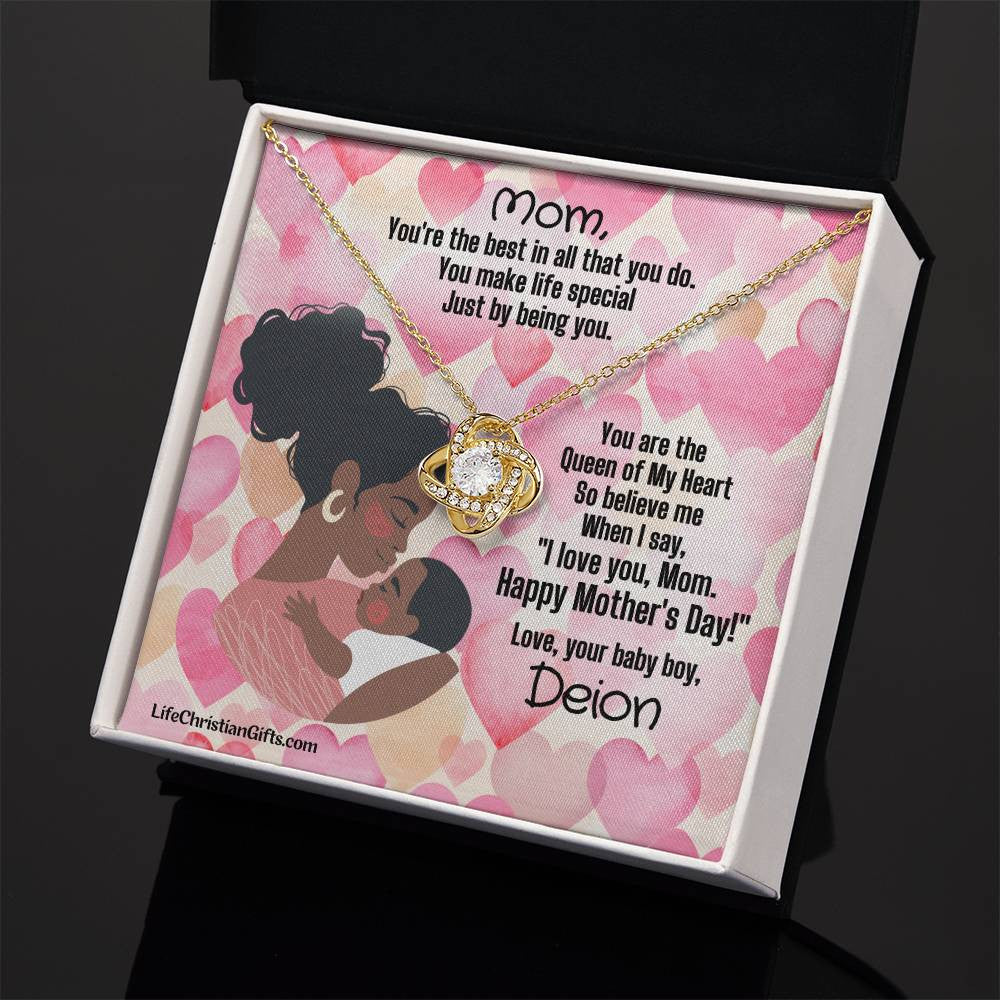 Melt mom's heart with this beautiful love knot necklace from her son this Mother's Day. Personalize the jewelry message card to create a unique gift with a simple heartfelt message. The card features an image of a young African American mother cherishing a moment with her newborn son.
