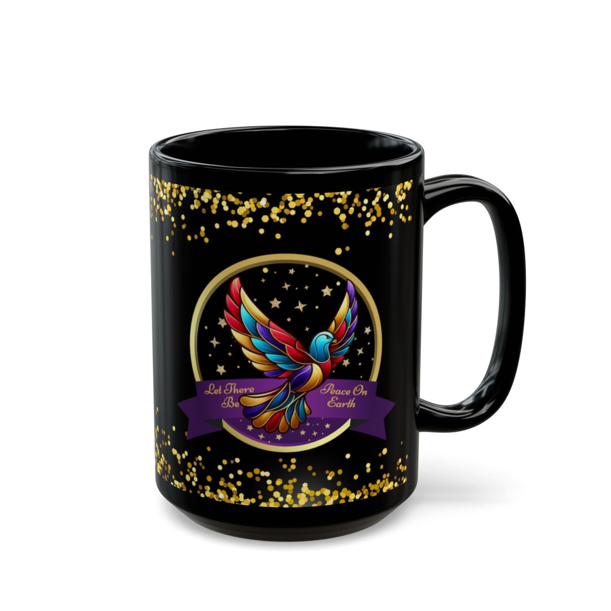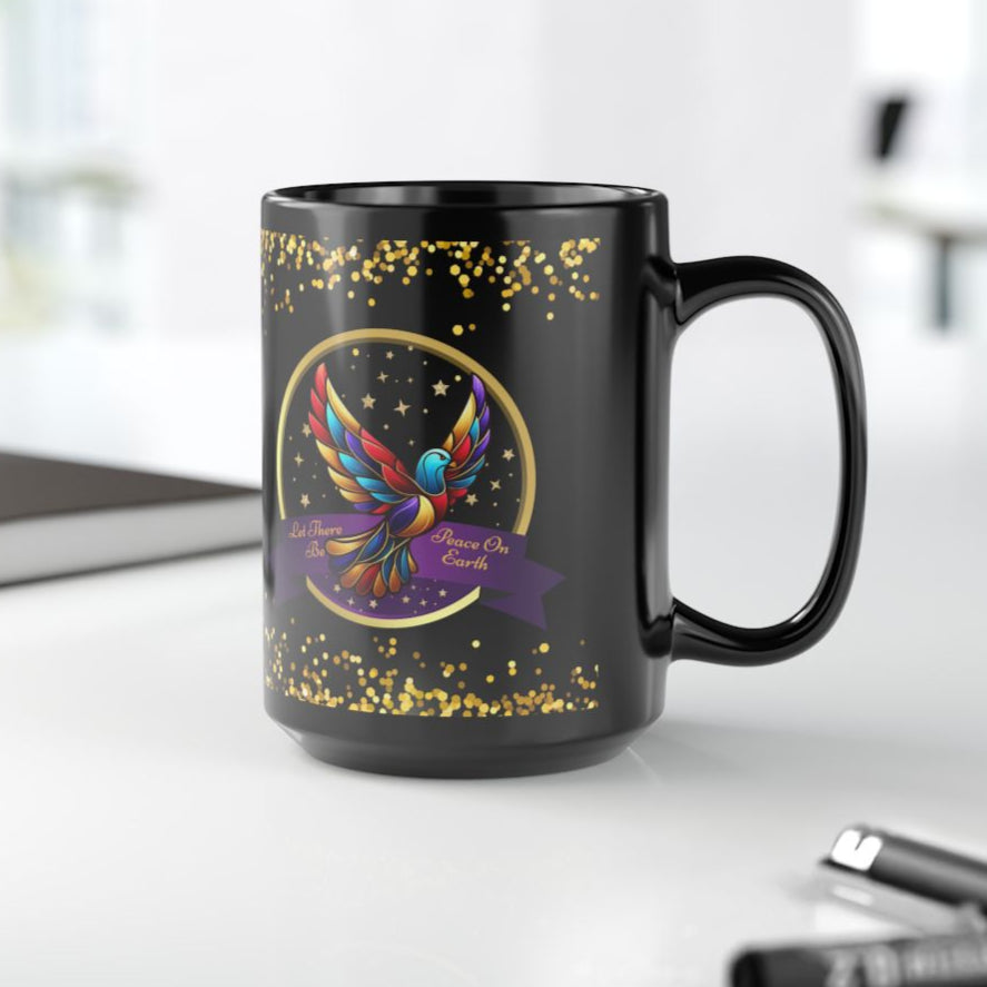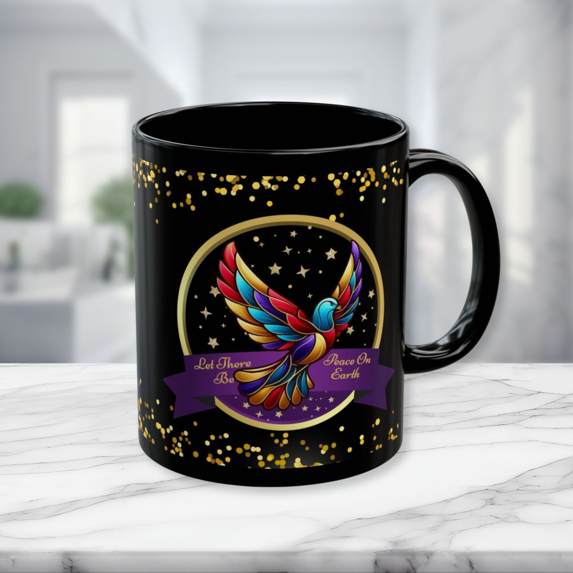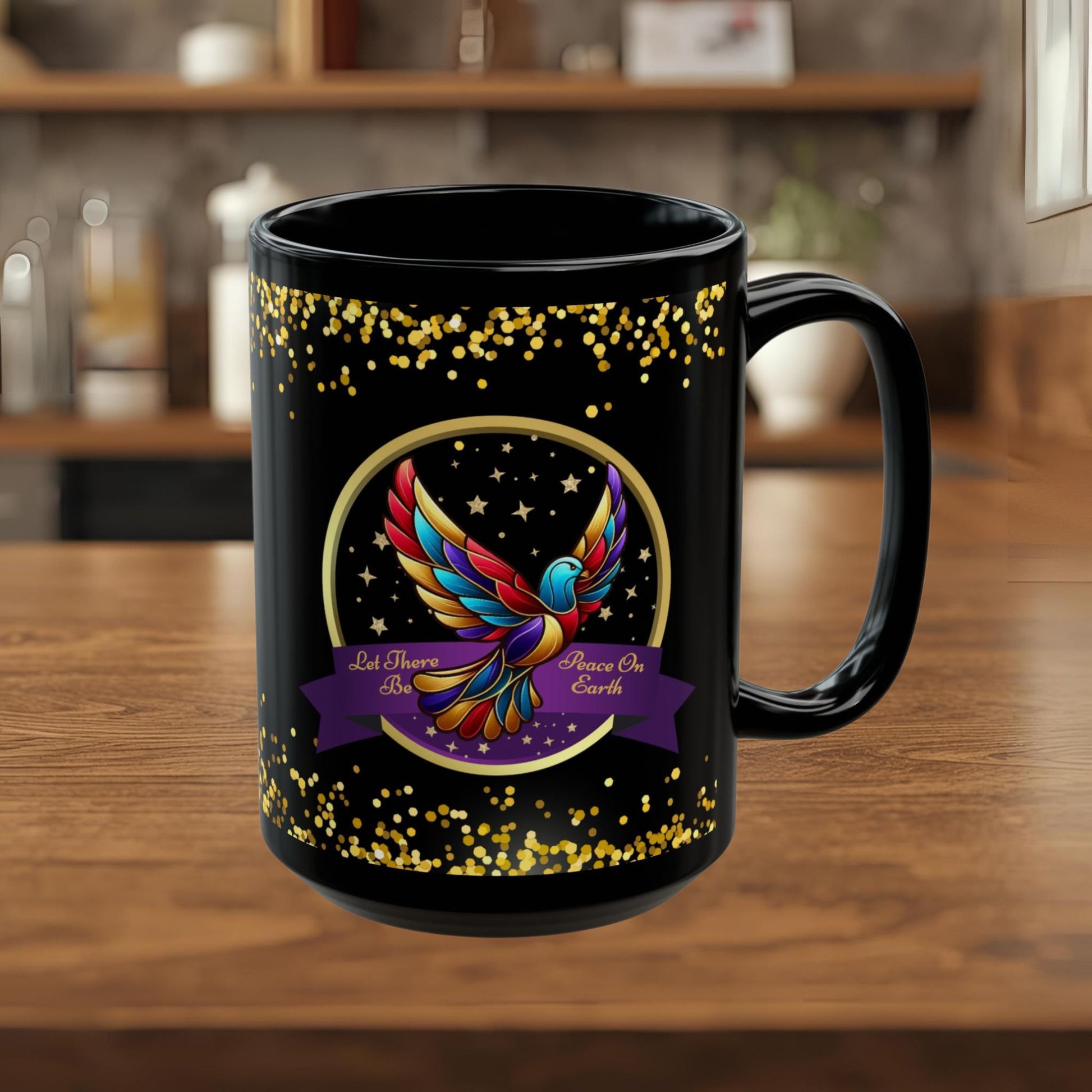 Celebrate the true spirit of Christmas with this beautifully designed Christian mug, featuring a radiant, multicolored dove surrounded by golden stars and the heartfelt message: “Let There Be Peace on Earth.” The glossy black background with shimmering golden accents makes this mug a meaningful and eye-catching addition to your holiday season.