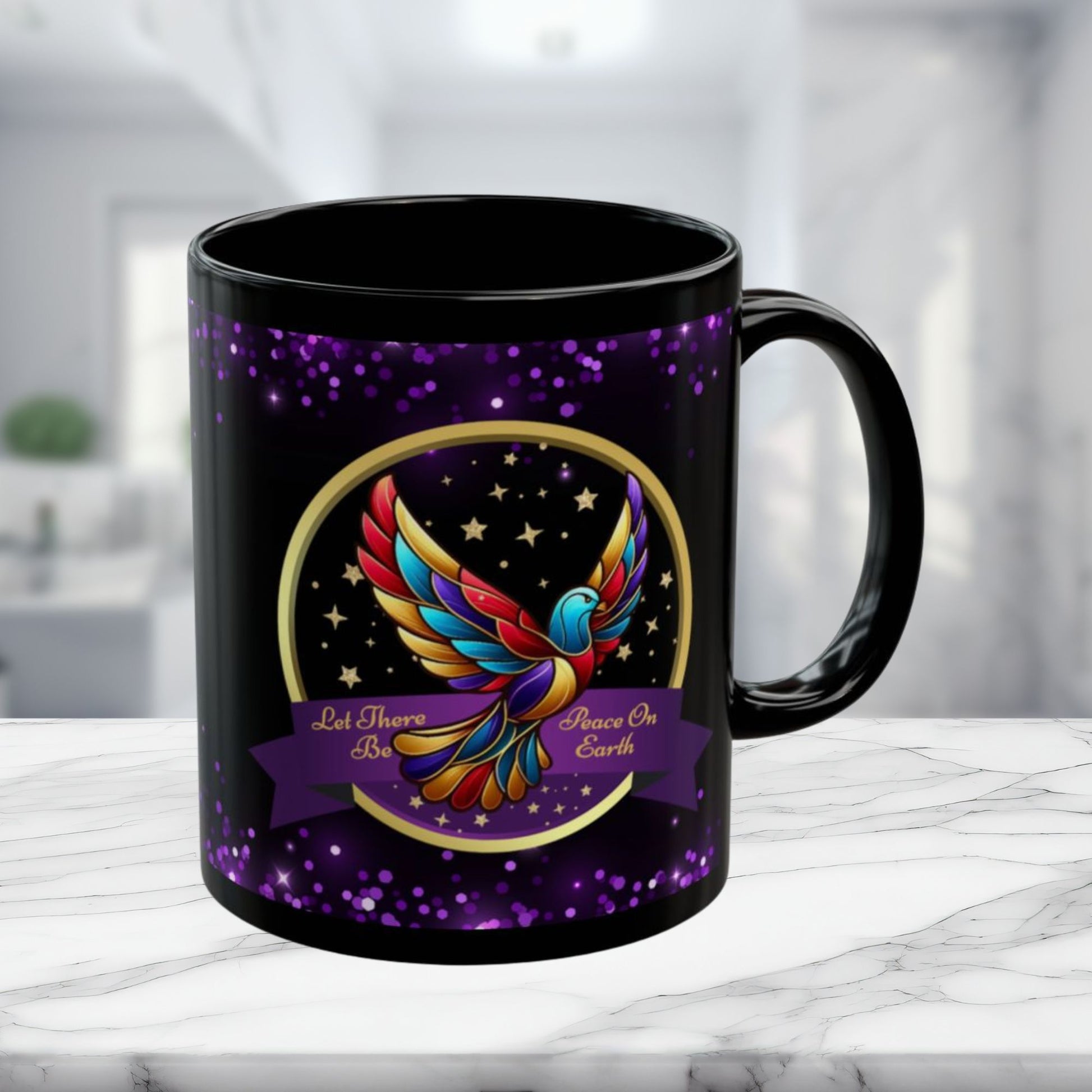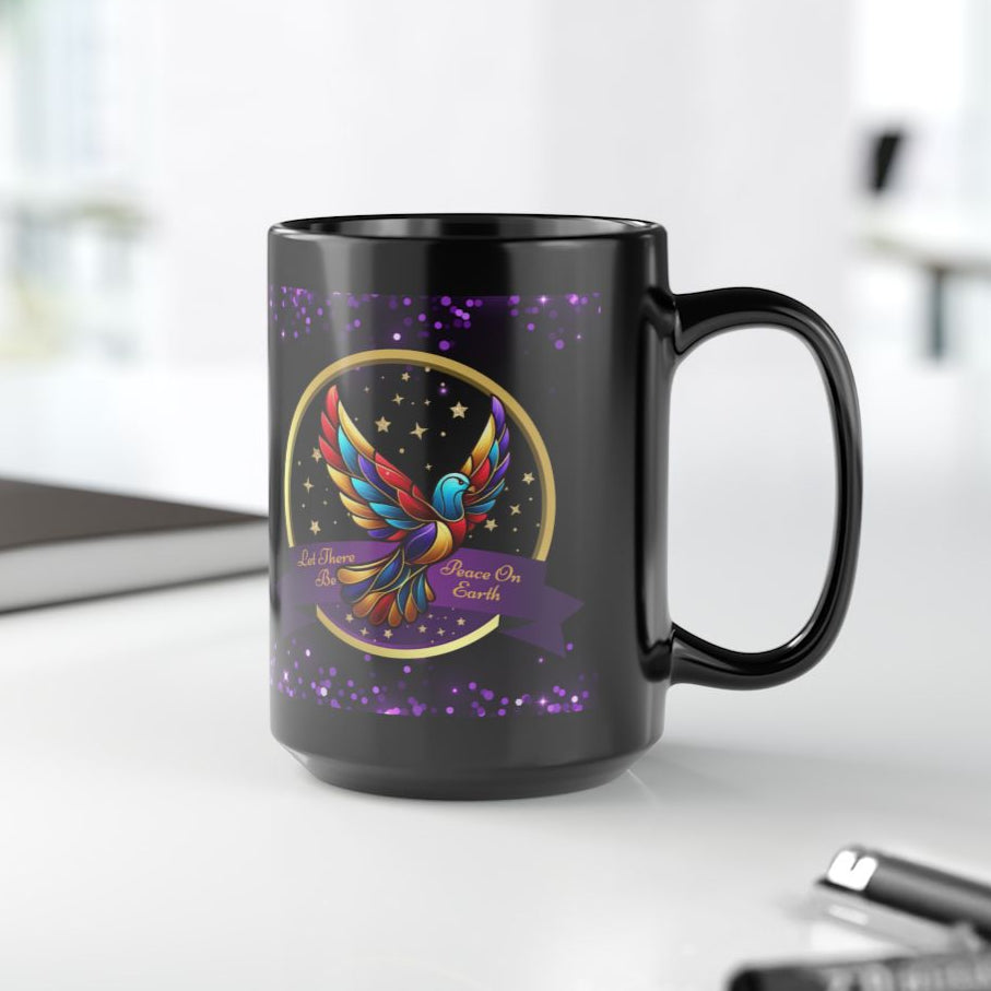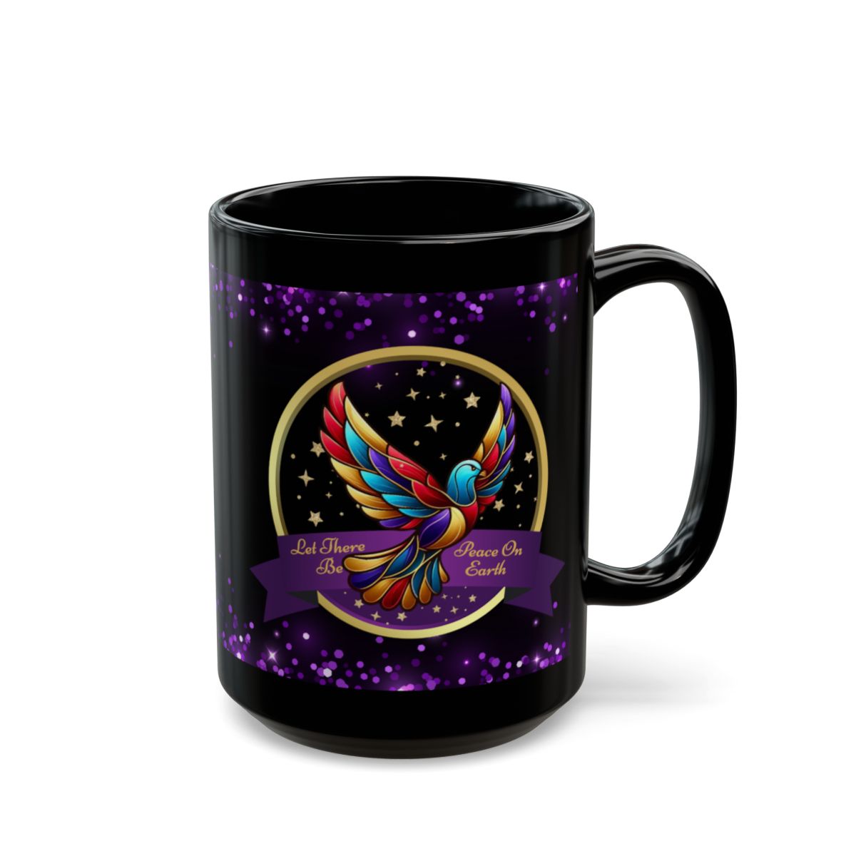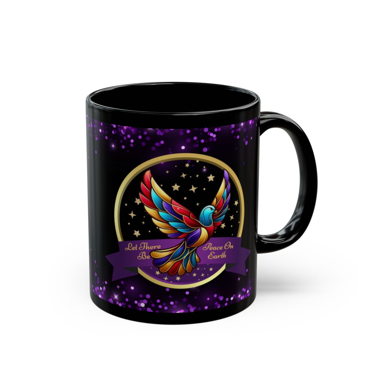 Celebrate the true spirit of Christmas with this beautifully designed Christian mug, featuring a radiant, multicolored dove surrounded by golden stars and the heartfelt message: “Let There Be Peace on Earth.” The glossy black background with shimmering purple accents makes this mug a meaningful and eye-catching addition to your holiday season.