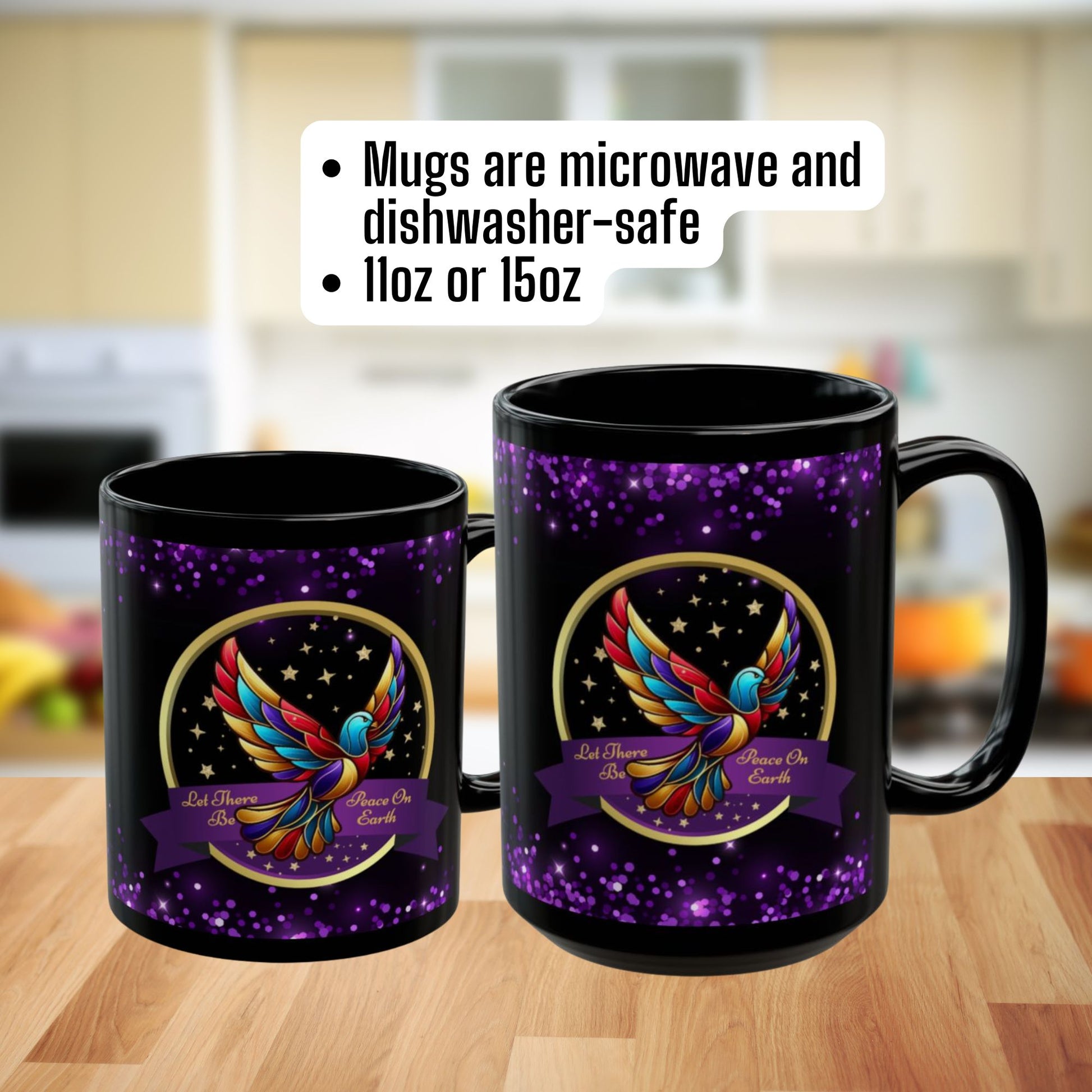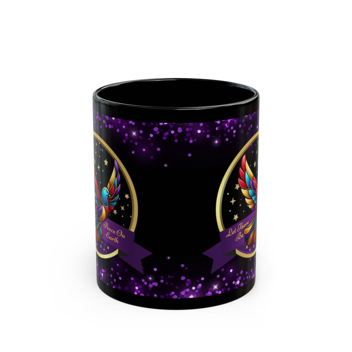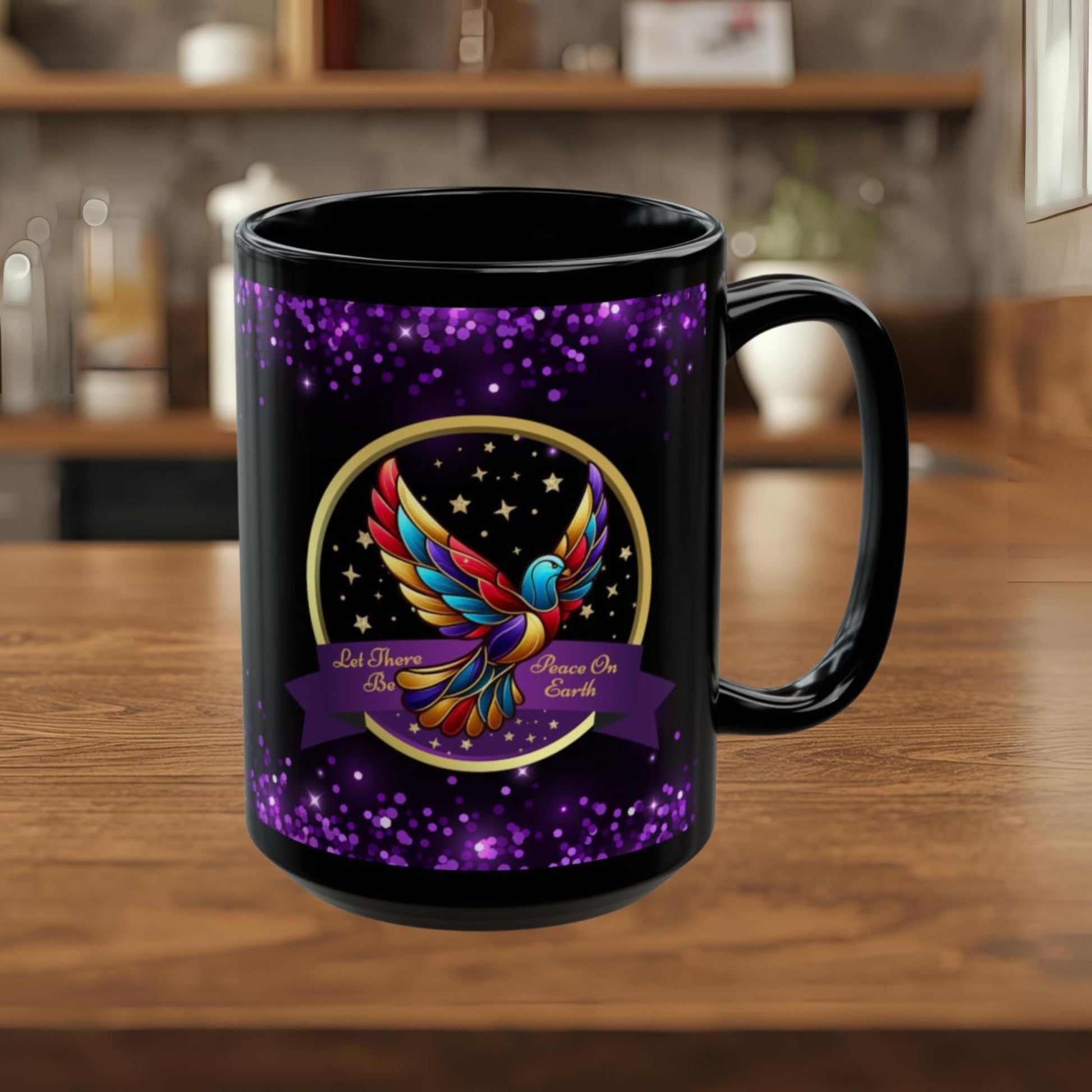 Celebrate the true spirit of Christmas with this beautifully designed Christian mug, featuring a radiant, multicolored dove surrounded by golden stars and the heartfelt message: “Let There Be Peace on Earth.” The glossy black background with shimmering purple accents makes this mug a meaningful and eye-catching addition to your holiday season.