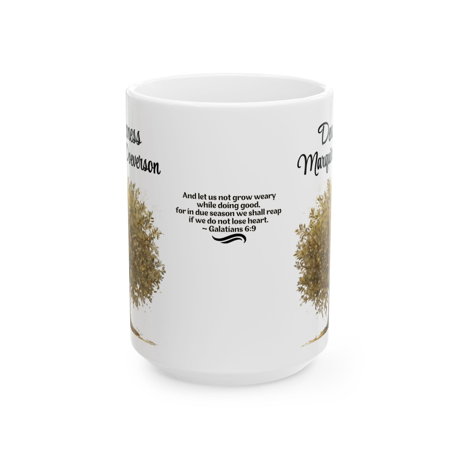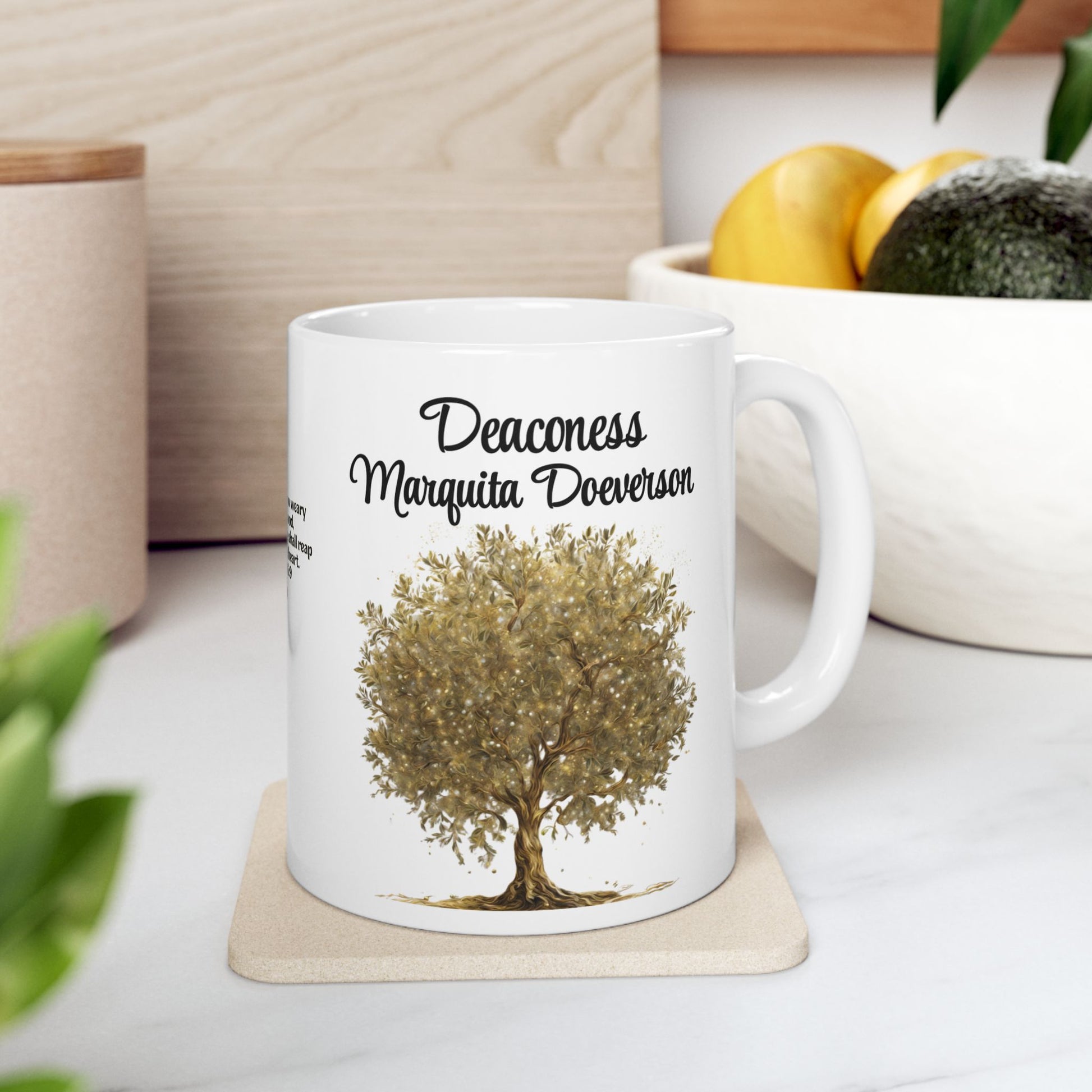 Personalize this mug for a special Deaconess in your life. The coffee mug features the Bible verse Galatians 6:9 and is adorned with a stunning golden tree design, symbolizing growth and wisdom. Perfect for Church Deaconess appreciation, birthdays, Mother’s Day, or Christmas gifts.️ The coffee mug is dishwasher and microwave-safe.