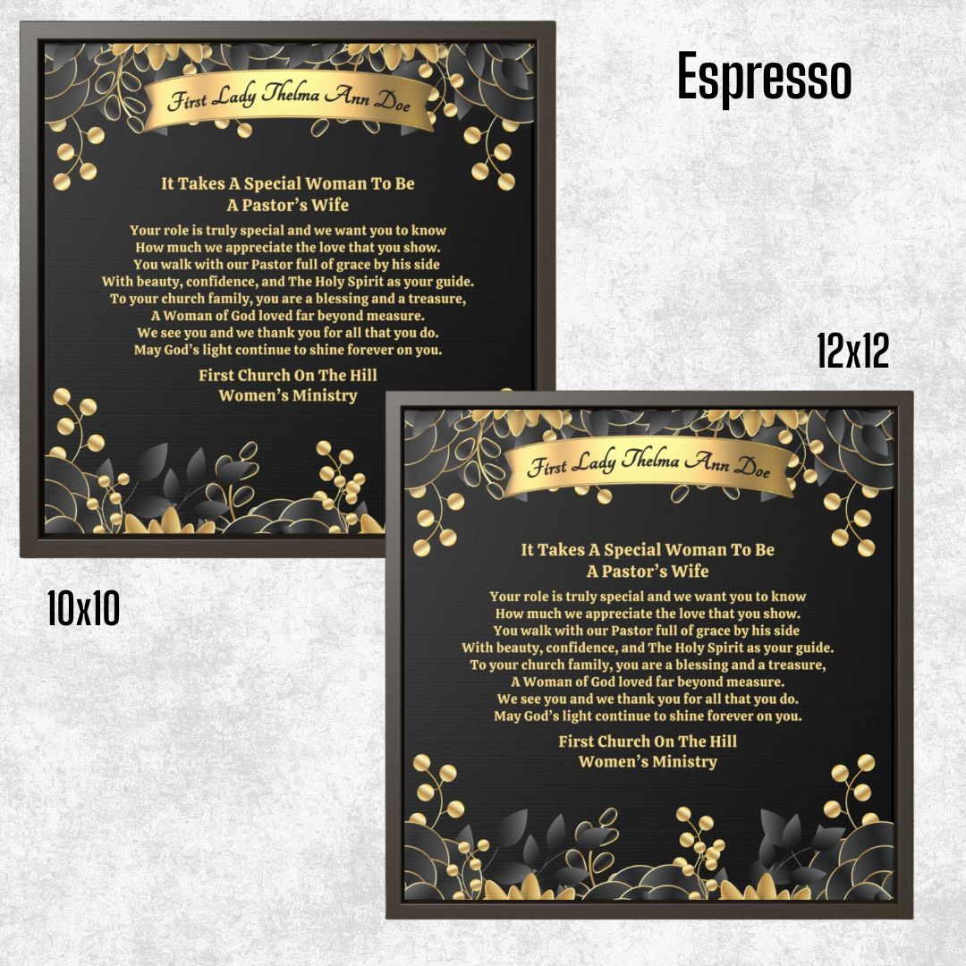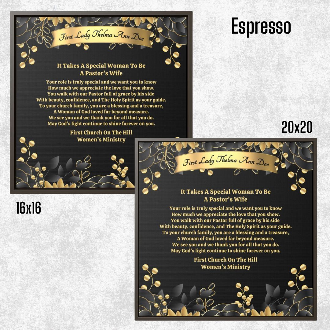 This Pastor's Wife Appreciation Canvas Wall Hanging creates a unique and meaningful gift for the pastor's wife from the church congregation. Crafted with attention to detail, this gallery-wrapped canvas features words in a poem of gratitude that your First Lady will cherish. The canvas wrap features words made specifically for a pastor's wife. It also features an area for her name and the church name. Makes a great gift for Pastor Appreciation Month, a milestone celebration, or any occasion. Crafted with premium materials, the canvas is stretched around the sturdy pinewood frame, offering a sleek, modern look that is ready to hang. The frame is available in black and espresso with four square sizes to choose from.