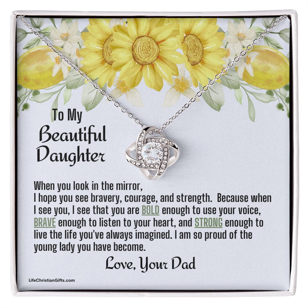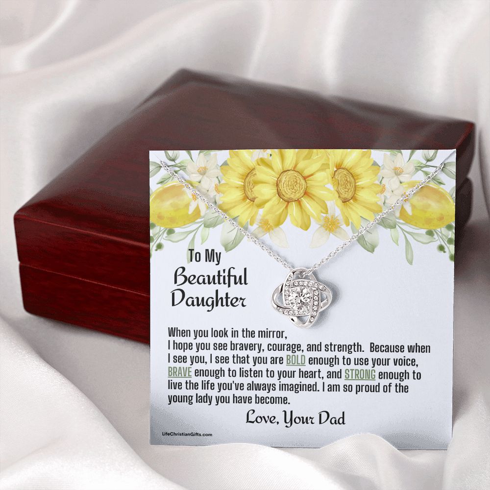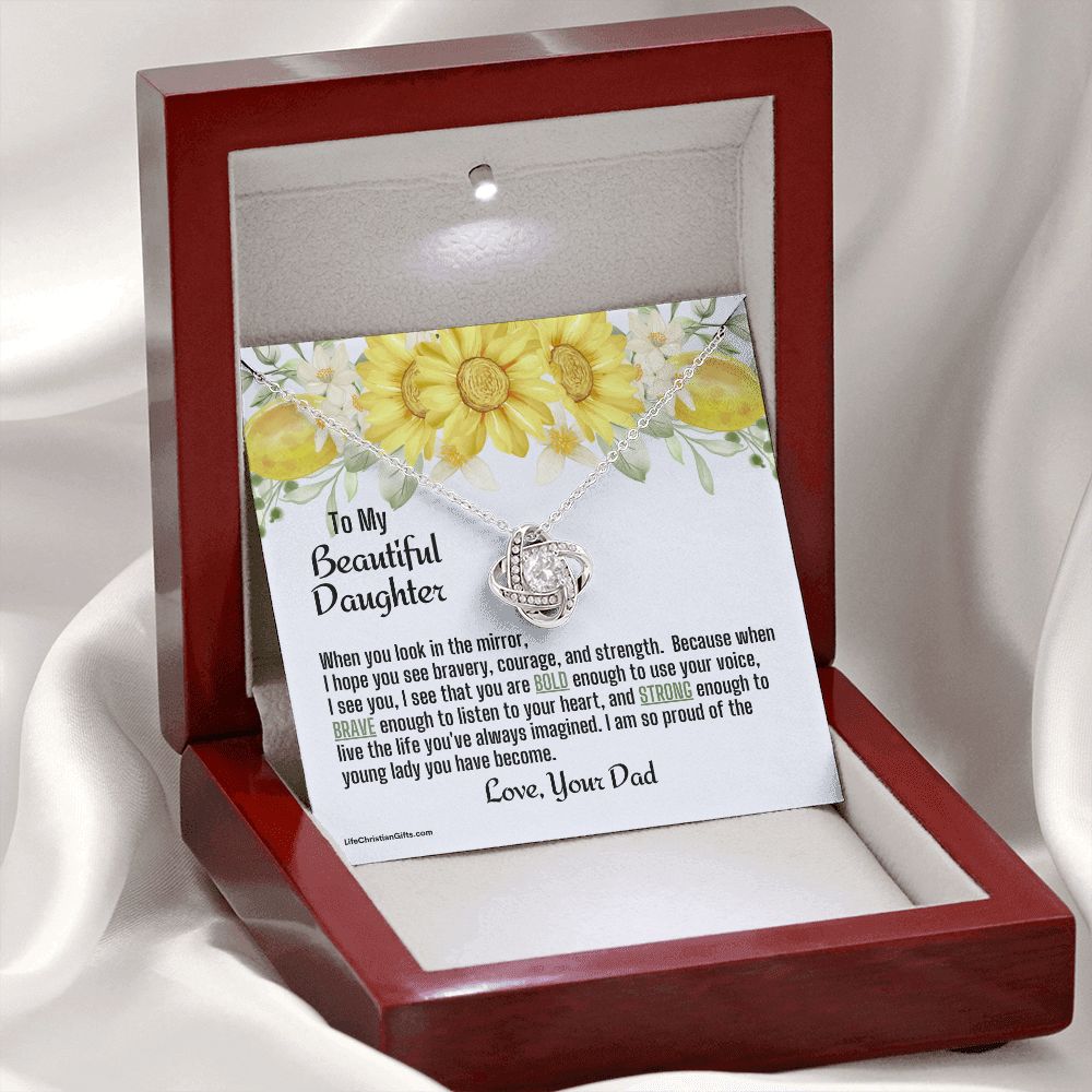 Daughter From Dad Love Knot Necklace | Look In The Mirror Message Card With Yellow Flowers