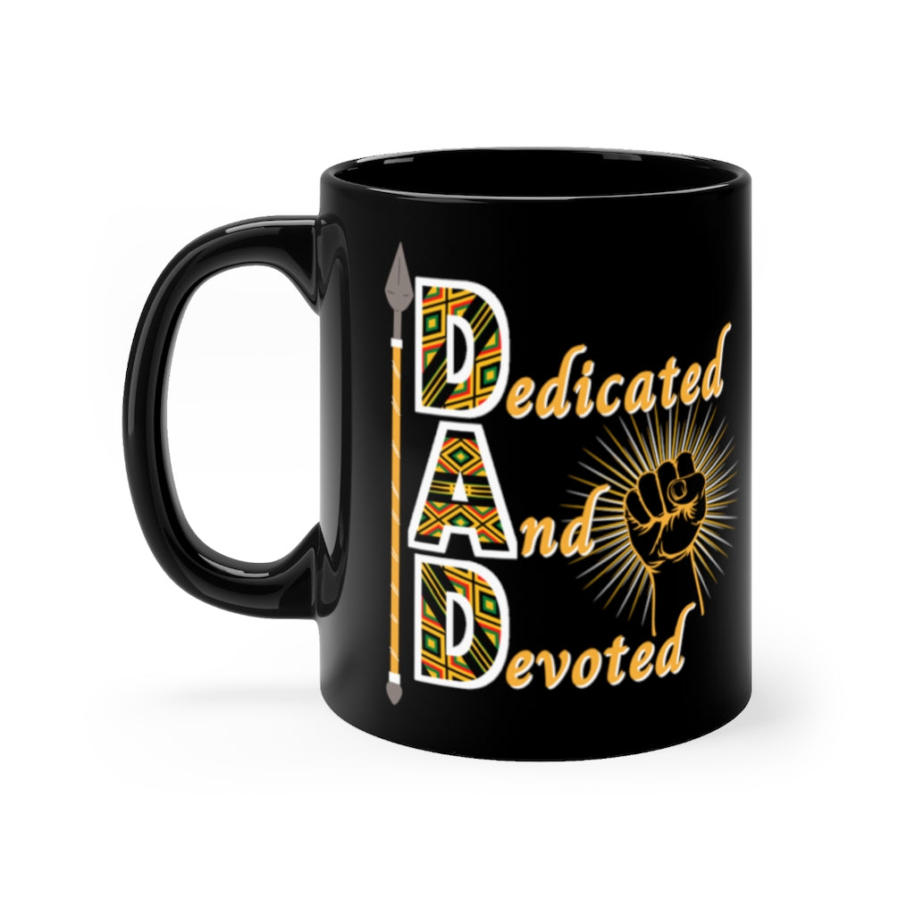 The perfect gift mug for the dad who is a dedicated and devoted father to his children. Your father, grandfather, son, husband, brother, or uncle will gladly show off this Kente pattern mug with pride. Perfect gift for Father's Day, birthday, or any gift-giving occasion. The cup features the word Dad as an acronym in a Kente African-like pattern. Our 11 oz traditional black mug is durable and both microwave and dishwasher safe.