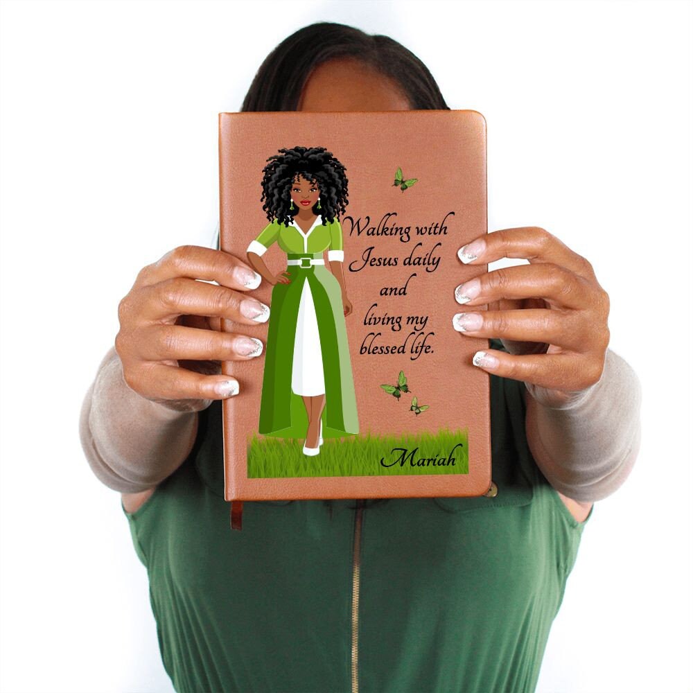 Introducing our African American vegan leather writing journal - Walking With Jesus And Living My Blessed Life. This Christian faith writing journal features an image of a beautiful young lady with an inspirational quote. Our graphic leather journal is the perfect accessory for Bible study, sermon notes, personal reminders, or just getting organized. Swapping between your important pages is easy thanks to the ribbon bookmark and elastic closure band. The unique front cover is professionally printed with vibrant colors, and personalized with your name making this truly a unique and sentimental gift that will be forever treasured!