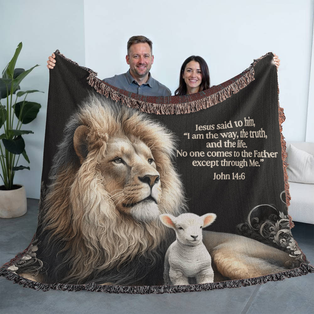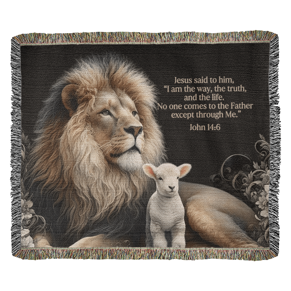 Personalize this exquisitely designed woven throw that features the Bible verse John 14:6 and images of a lion and a lamb! The cozy blanket showcases stunning images, transforming them into lasting heirlooms. Crafted with precision, our thick weavings are perfect for both wall displays and snuggling on the couch. Each blanket is thoughtfully customized, making it a unique and heartfelt gift for your loved ones. Our woven throws are made from 100% cotton yarn and feature a colorful edge fringe that beautifully complements the design. Elevate your home decor with these warm and cherished personalized woven throws.