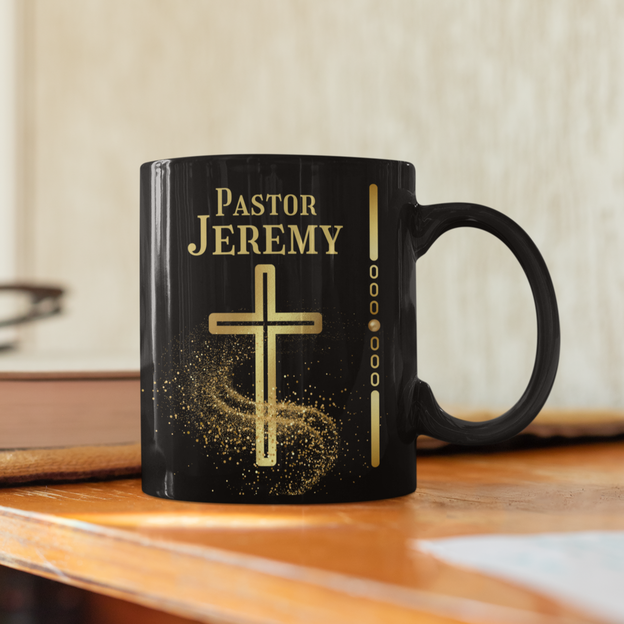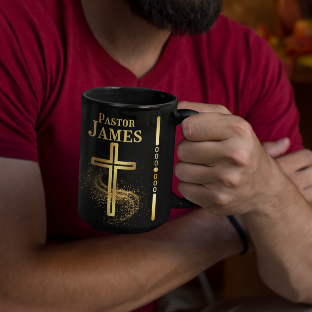 Our Pastor Appreciation/Anniversary Mug is a heartfelt way to express your appreciation for the pastor's dedication and devotion to the church and community. Personalize this beautifully crafted black ceramic mug with the name of your pastor (title can be changed). The coffee cup features a gold cross with swirls of gold confetti. It is the perfect gift idea for Pastor Appreciation Month or a church anniversary celebration. Your pastor will enjoy a cup of coffee, hot chocolate, or tea with this custom mug just for him or her.