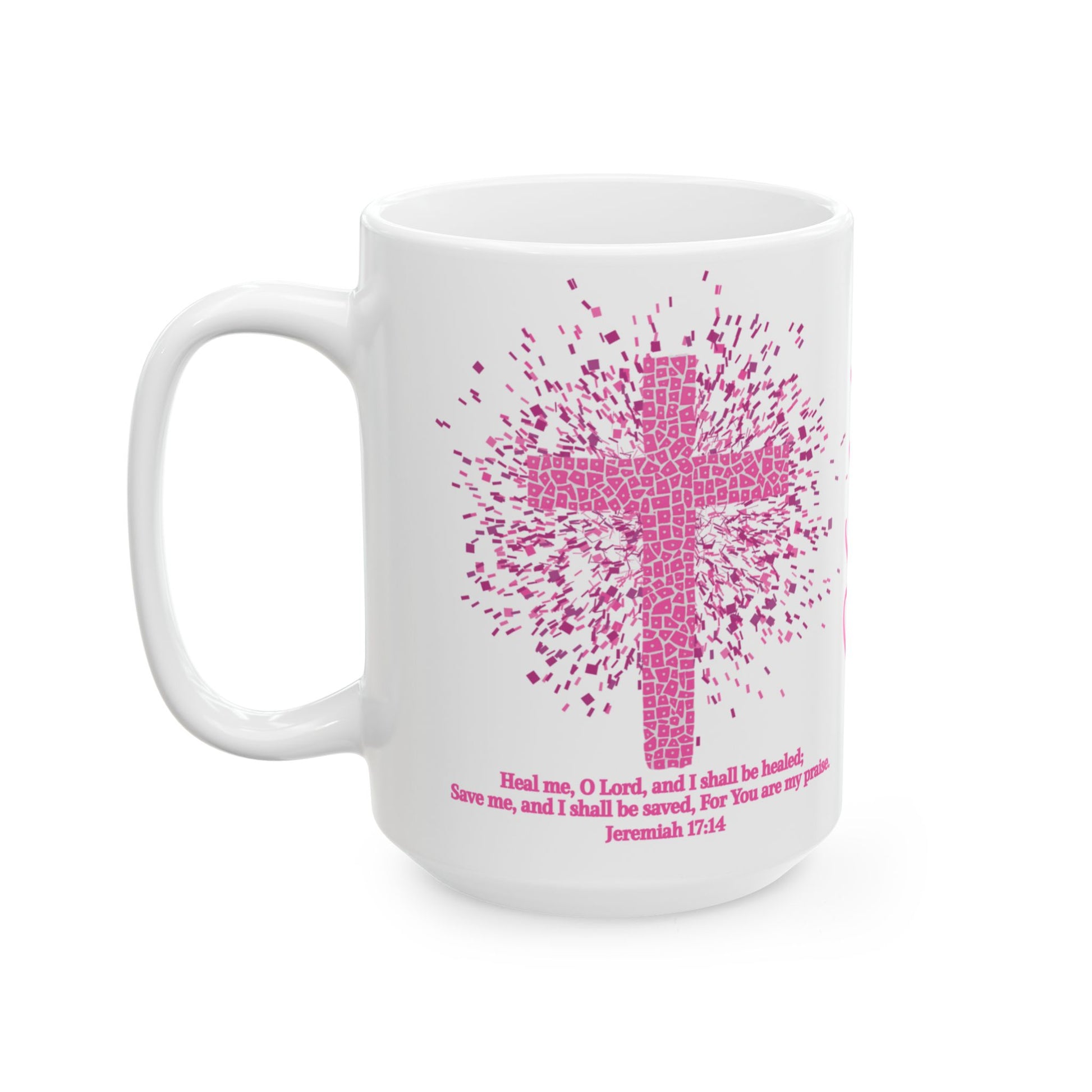 This beautiful, bright Christian mug is the perfect way to start your day with faith and encouragement. This coffee cup features a stunning mosaic cross design in vibrant pink, along with the Bible verse Jeremiah 17:14, which serves as a daily affirmation of healing and salvation.