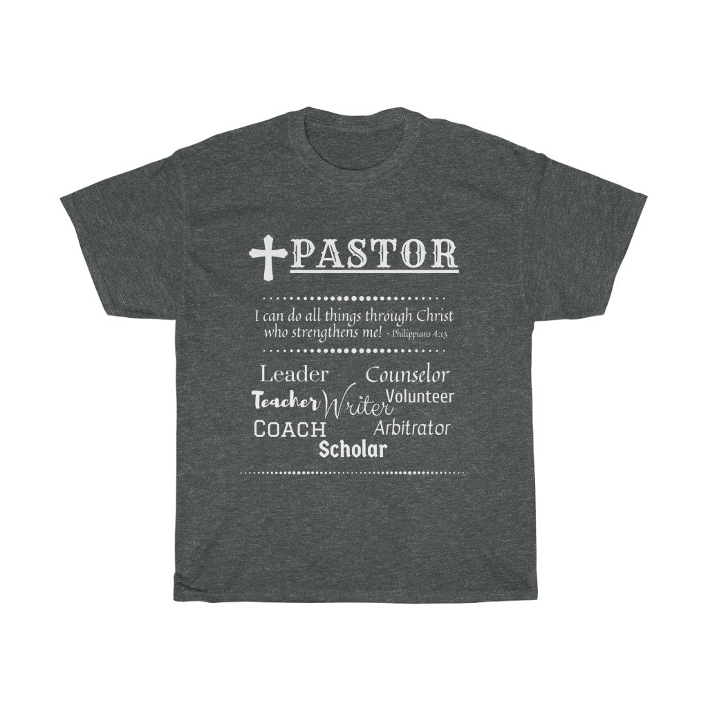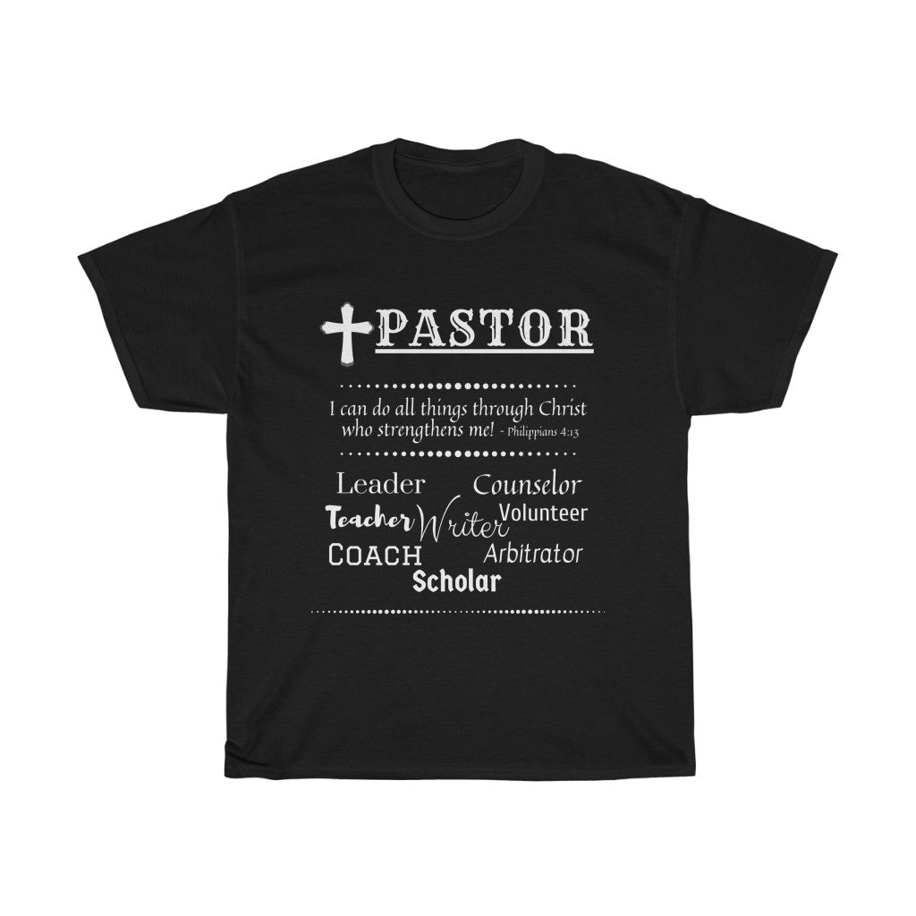 What a great t-shirt gift for Clergy / Pastor Appreciation Month in October. Don't let your pastor go casual in just anything! Make sure your minister has this t-shirt as part of his "time to relax" wardrobe. The t-shirt features the many roles of the pastor and reads Pastor ~ I can do all things through Christ who strengthens me! Philippians 4:13. Leader, counselor, teacher, writer, coach, volunteer, scholar, arbitrator. We could go on and on, but you get the picture. Your pastor will love that this tee feels soft, lightweight, and with the right amount of stretch. It's comfortable and flattering for both men and women.