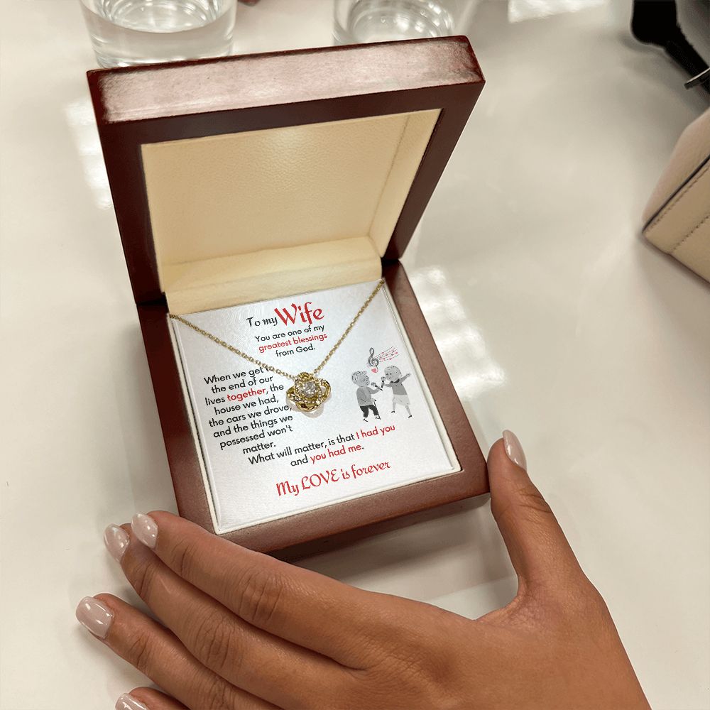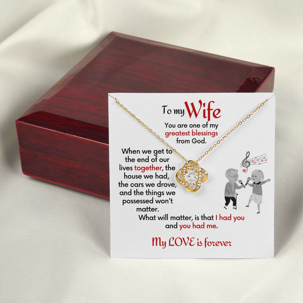 Your wife will absolutely fall in love with this beautiful Love Knot Necklace. This to-wife-from-husband gift necklace comes with a jewelry message card that shares a loving message to remind her how much in love with her you still are.