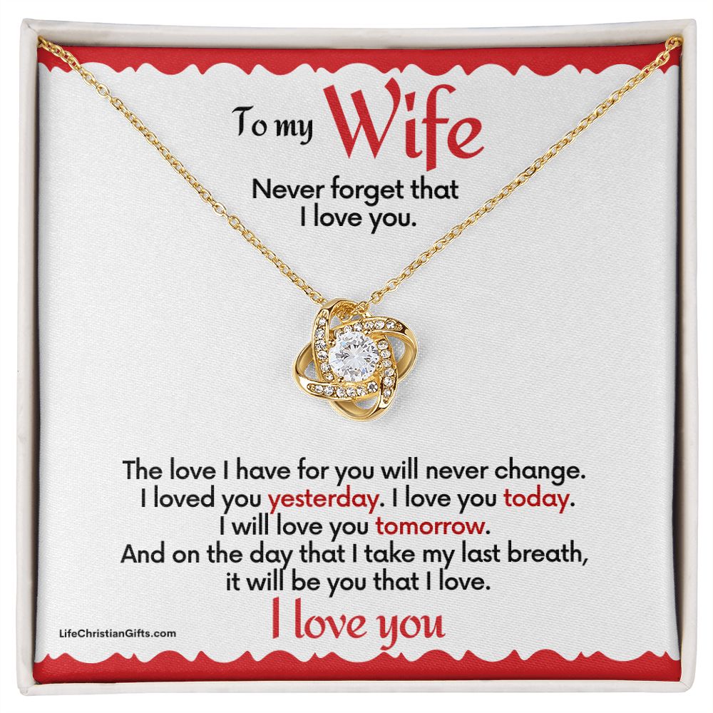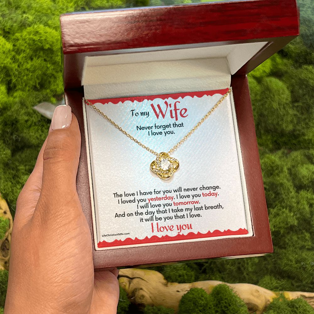 Your wife will absolutely fall in love with this beautiful Love Knot Necklace. This to-wife-from-husband gift necklace comes with a jewelry message card that shares a loving message to remind her how much in love with her you still are.