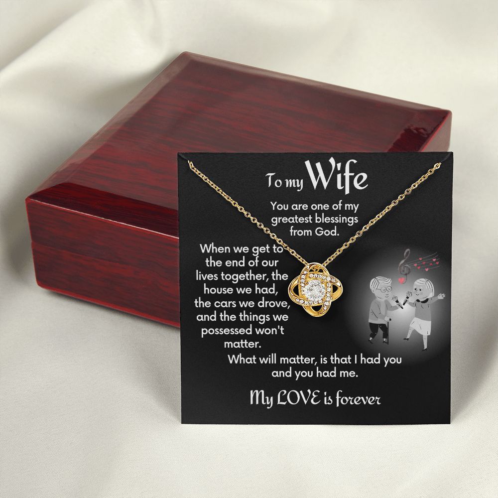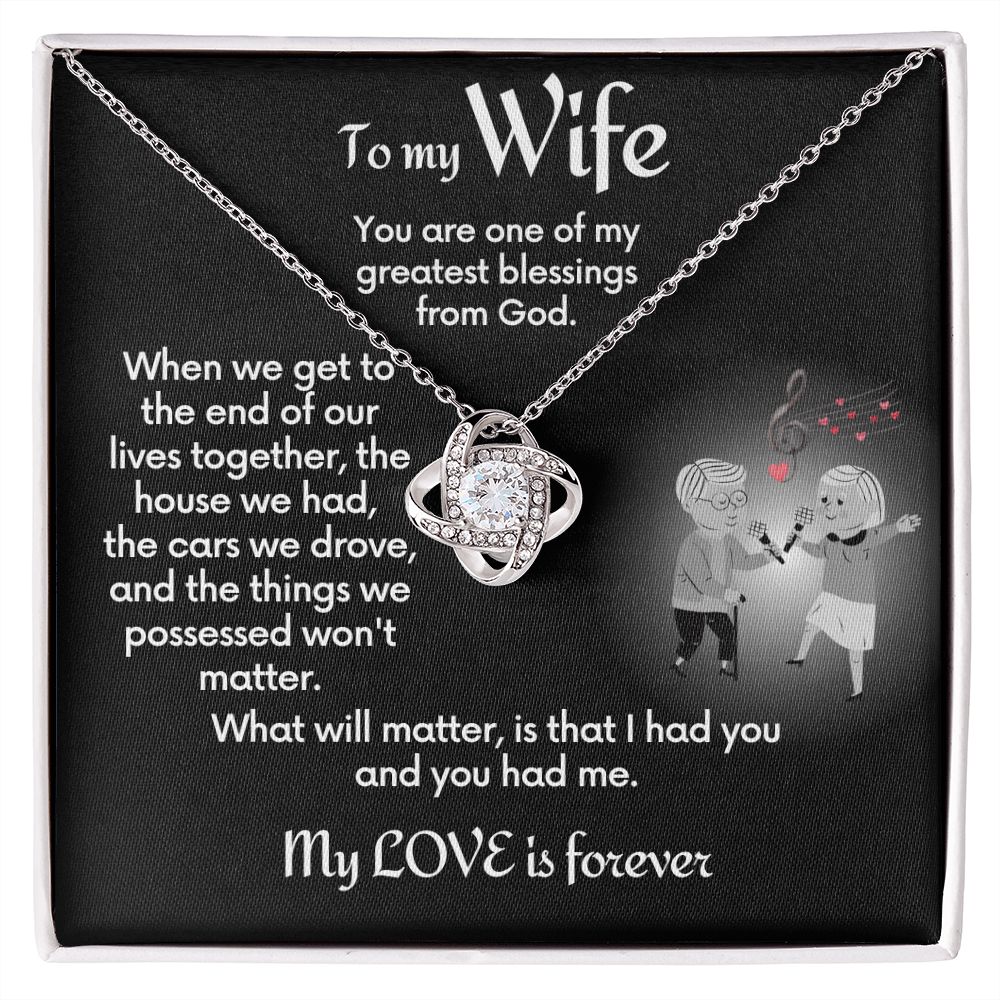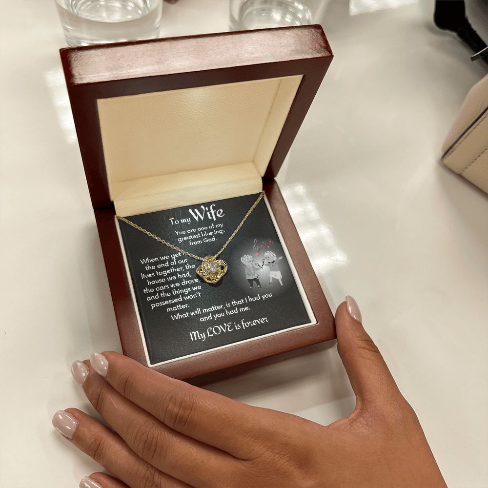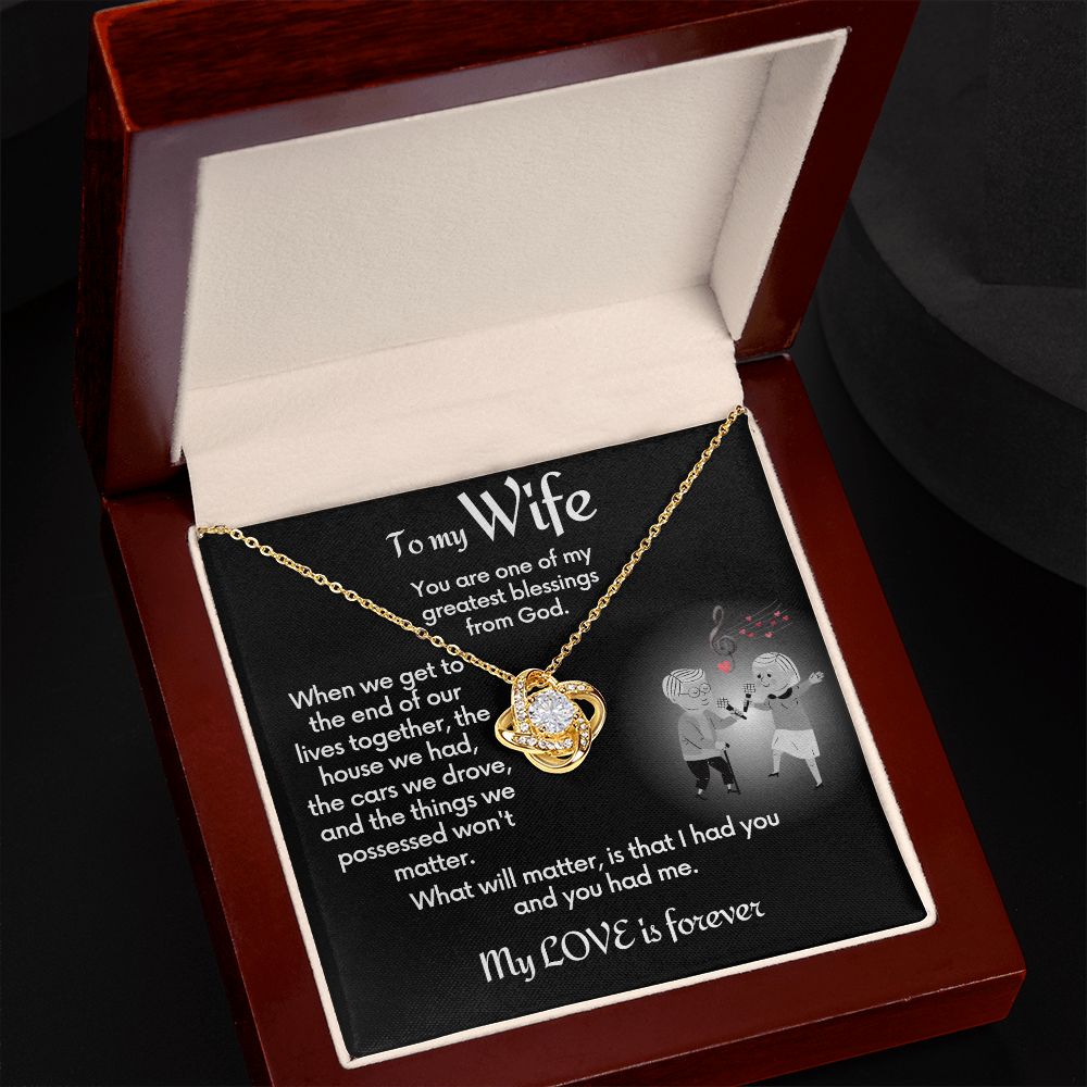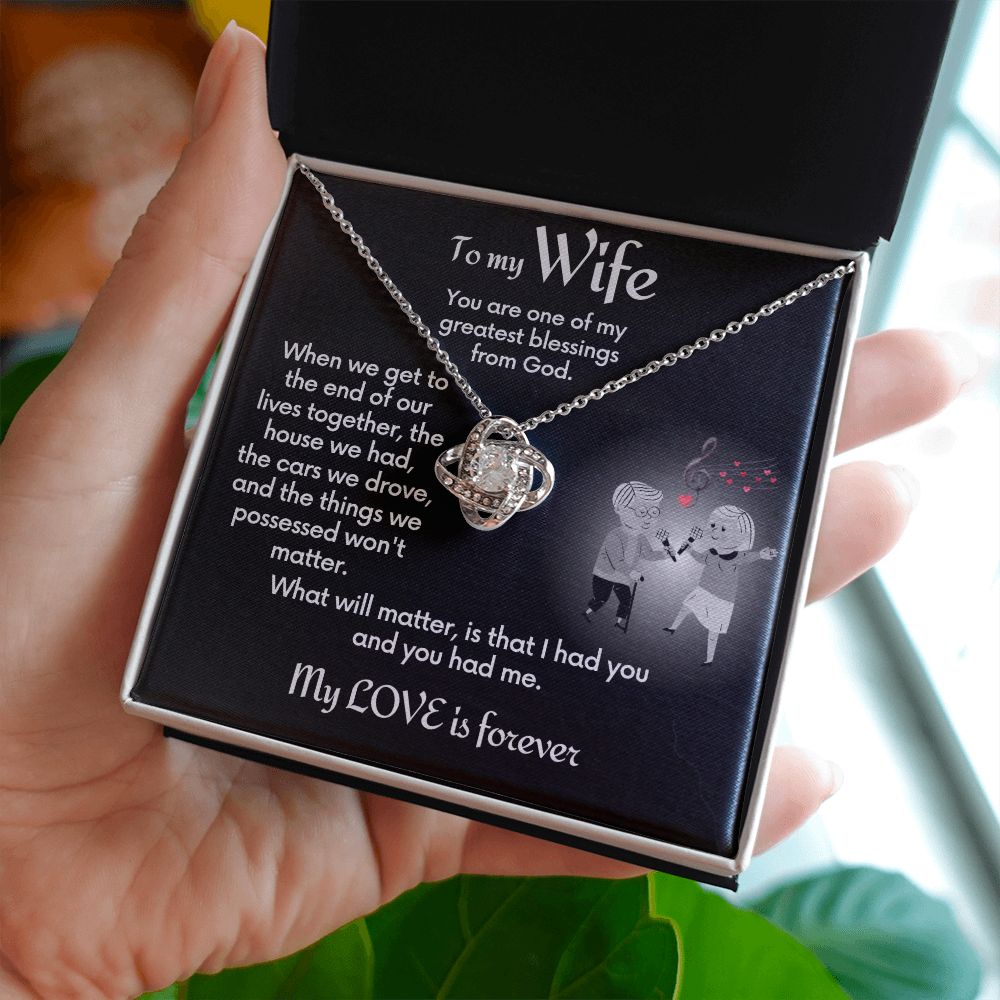 Your wife will absolutely fall in love with this beautiful Love Knot Necklace. This to-wife-from-husband gift necklace comes with a jewelry message card that shares a loving message to remind her how much in love with her you still are.