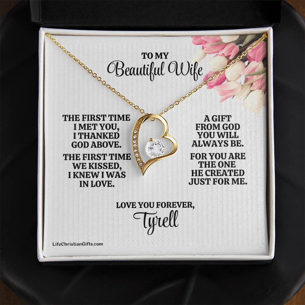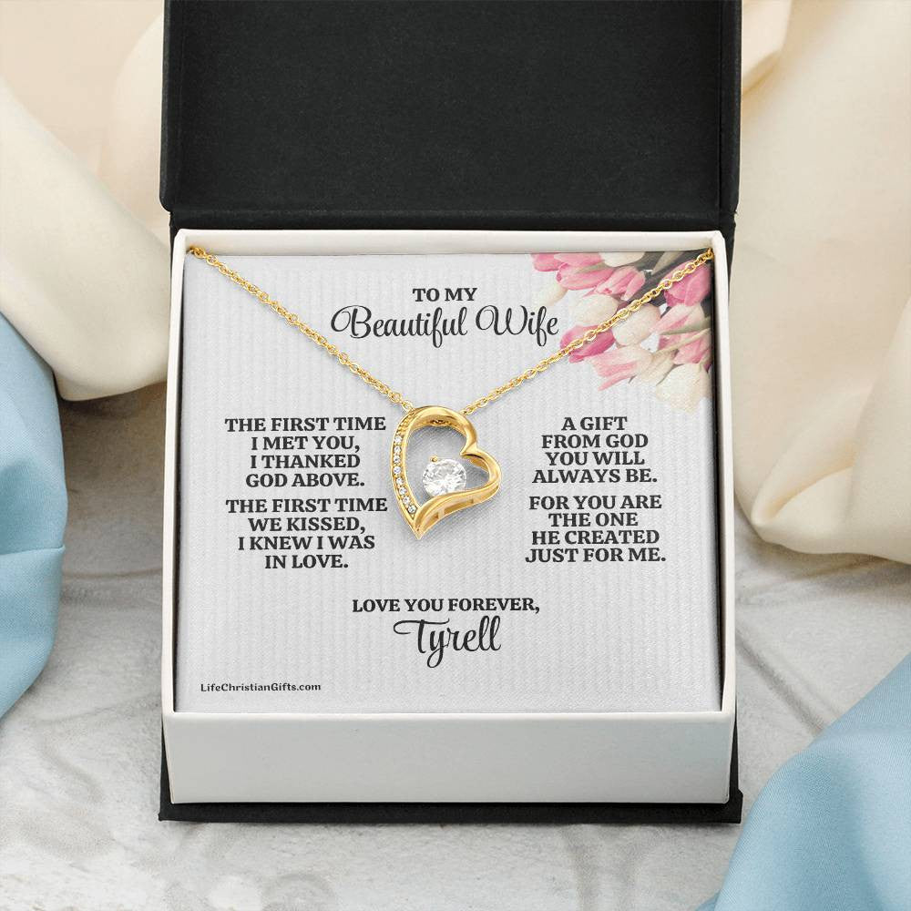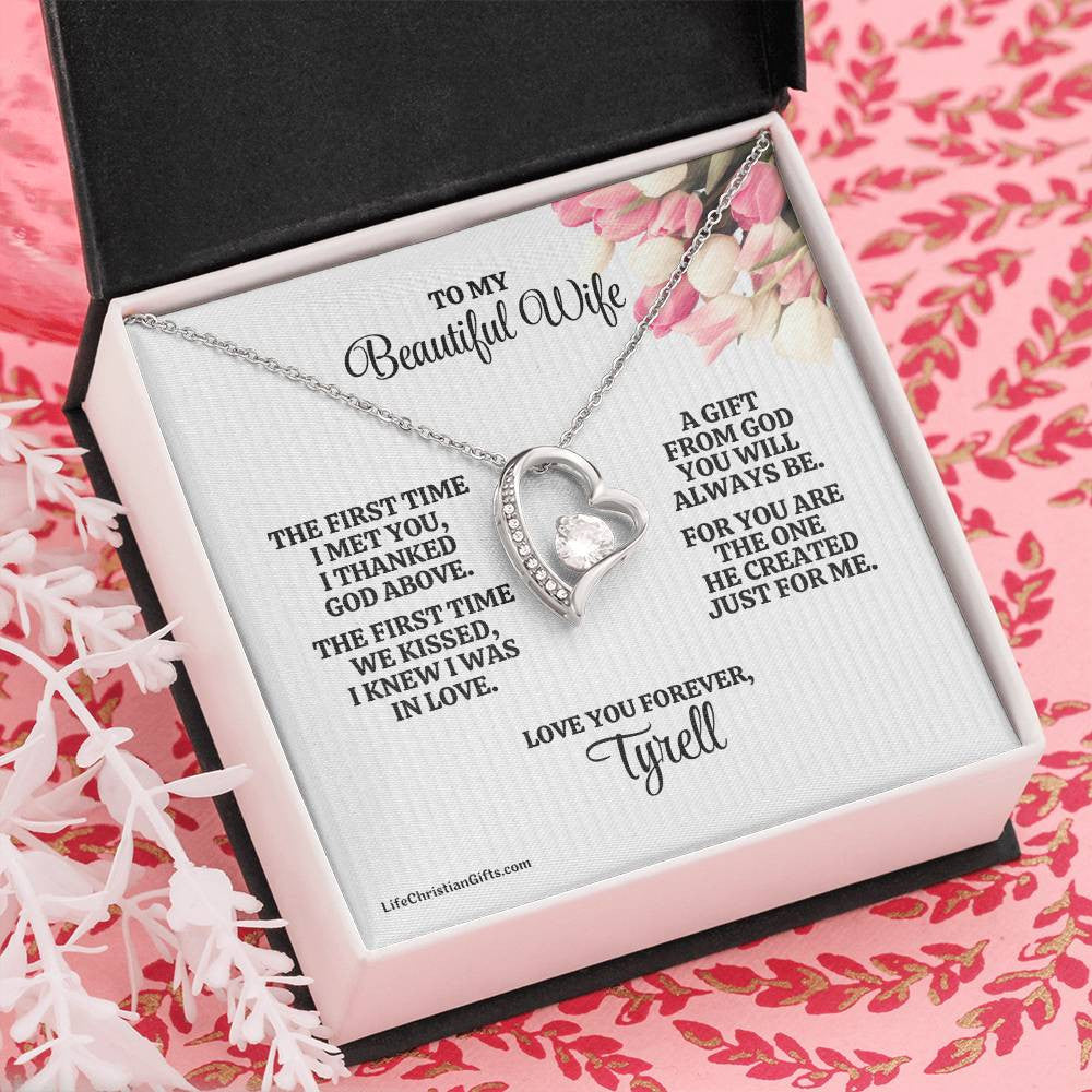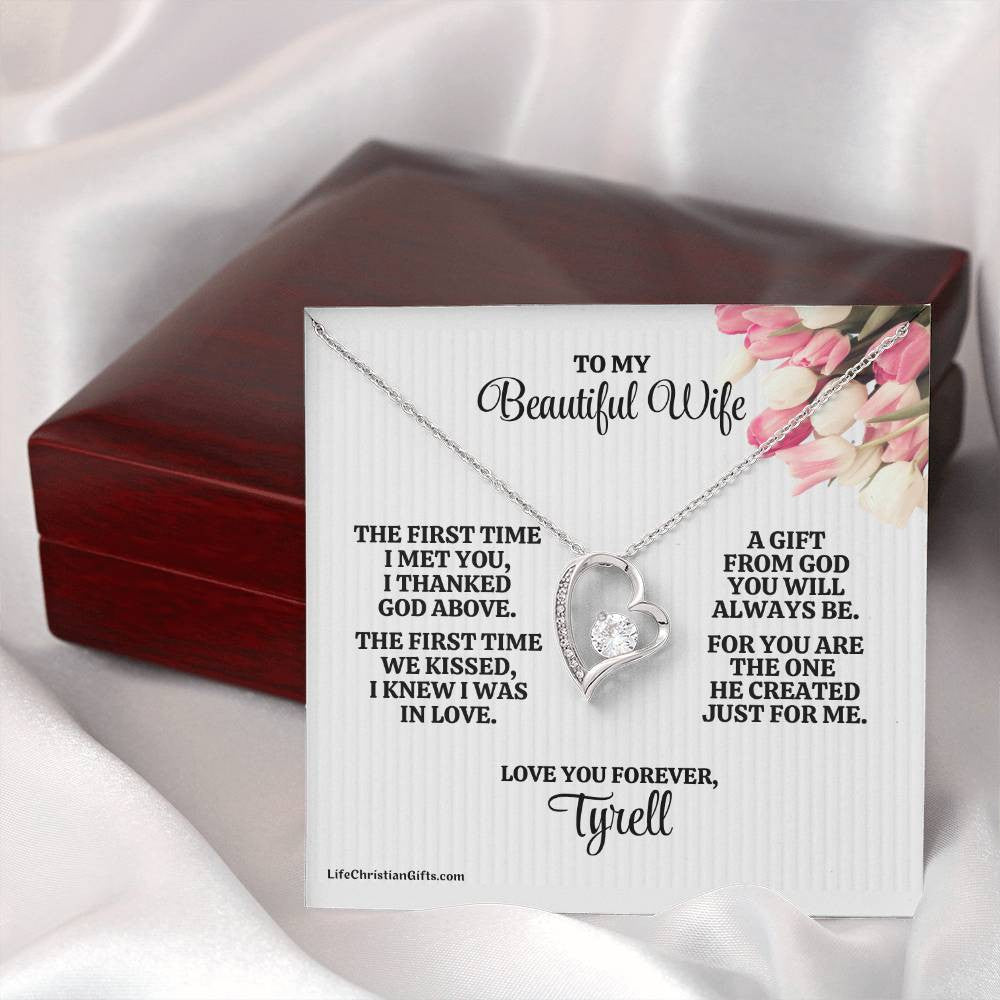 Express to your wife, the love of your life, how much you love her with this heartfelt message card and Forever Love Necklace. This gift is a beautiful reminder that true love is a blessing from God. To make this gift extra special, the message card is personalized with your printed name. This card, necklace, and gift box will present the perfect gift for your wife's birthday, Christmas, Valentine's Day, or just because you want to say, "I love you" in a unique way.